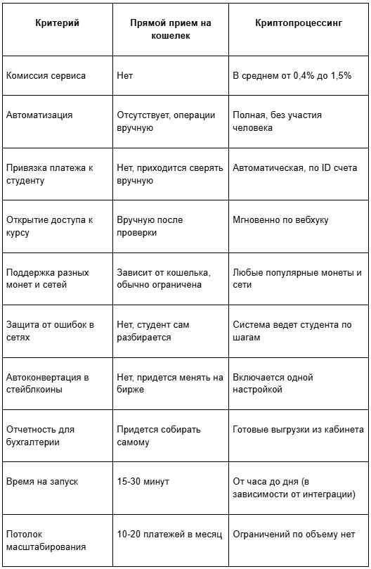 Прямой прием на кошелек работает для маленьких проектов с десятком платежей в месяц. Как только школа выходит за пределы «один автор, два курса» — становится понятно, что ручной режим убивает масштабирование.
